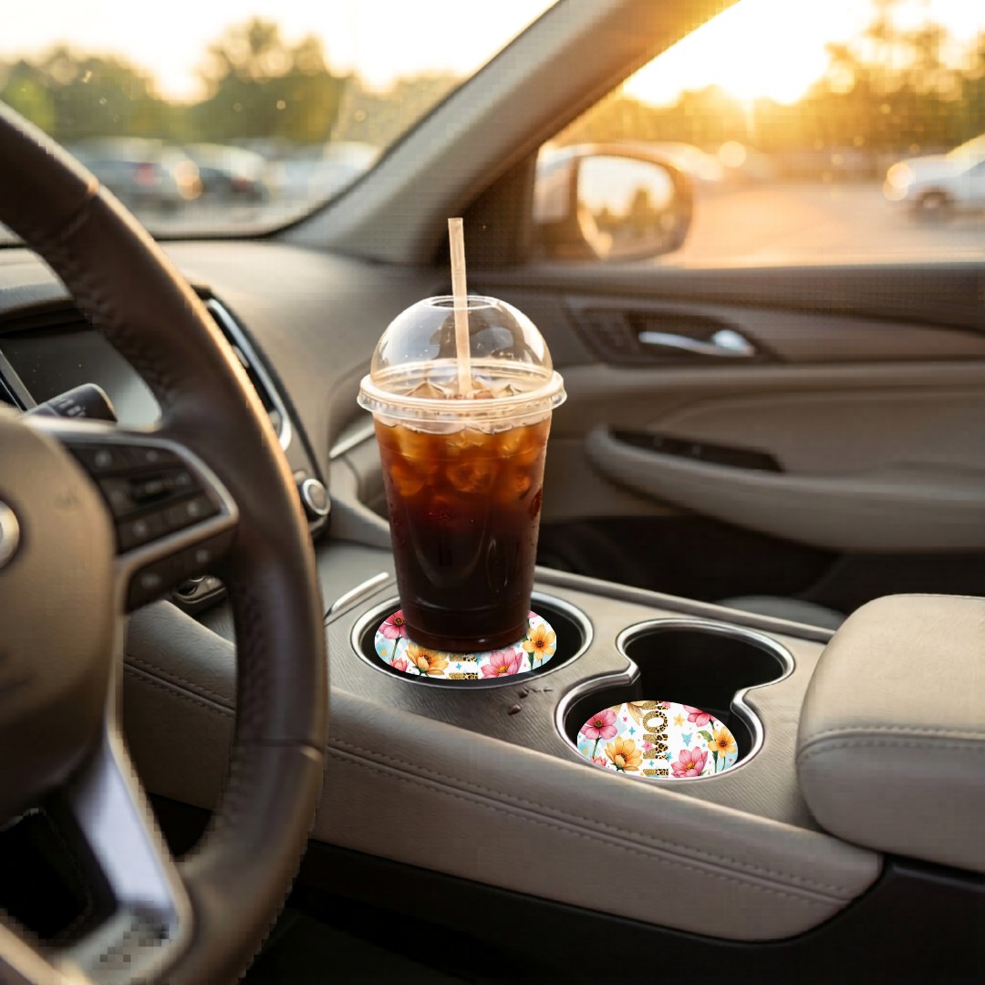 Care: Remove, rinse or wipe clean, and air dry before placing back in your car. Made of Neoprene and each coaster is 2.75".