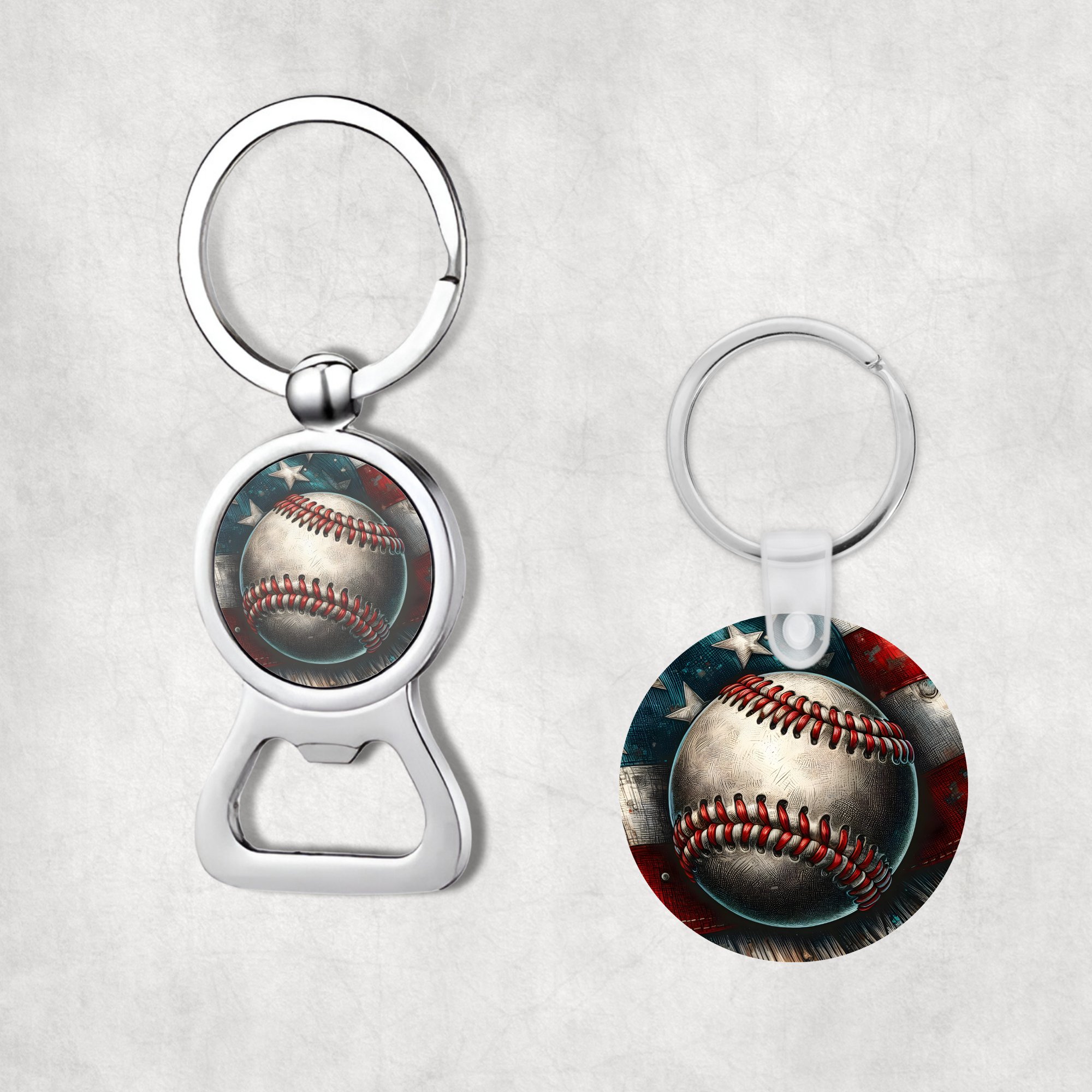 Keychain options: Bottle Opener Keychain are metal and have a 1" image. Round Keychains are made of MDF and are 2". Great for everyday use and make great gifts.